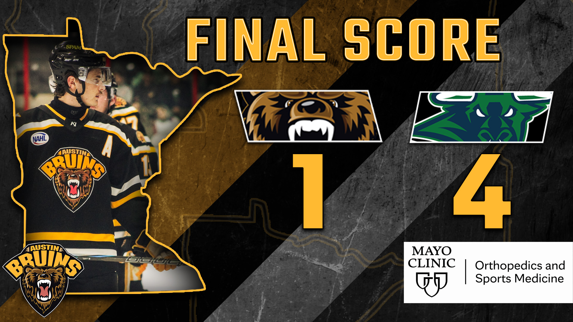 MASON CITY, IOWA – The eight game winning streak came to a halt Friday night as the Austin Bruins (30-9-2-1, 63 pts) fell 4-1 to the North Iowa Bulls (20-18-1-3, 44 pts).