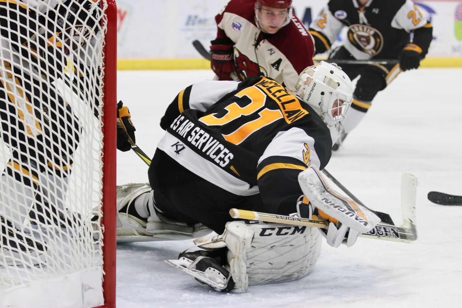 That lead held through the second period and well into the third thanks to strong netminding by the Minotauros, Ben Garrity. On the other side, McClellan battled to keep the Bruins in the game turning aside point-blank shot after bullrush after one-timer.