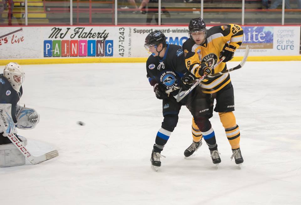 AUSTIN, MN – Steven Quagliata scored twice while Joe Marcoullier made 28 saves and the Bruins fell to the Coulee Region Chill, 4-1 on Saturday night at Riverside Arena. It was the 11th win in 12 games by the road team in the head to head series between Austin and Coulee Region, dating back to the start of last season.