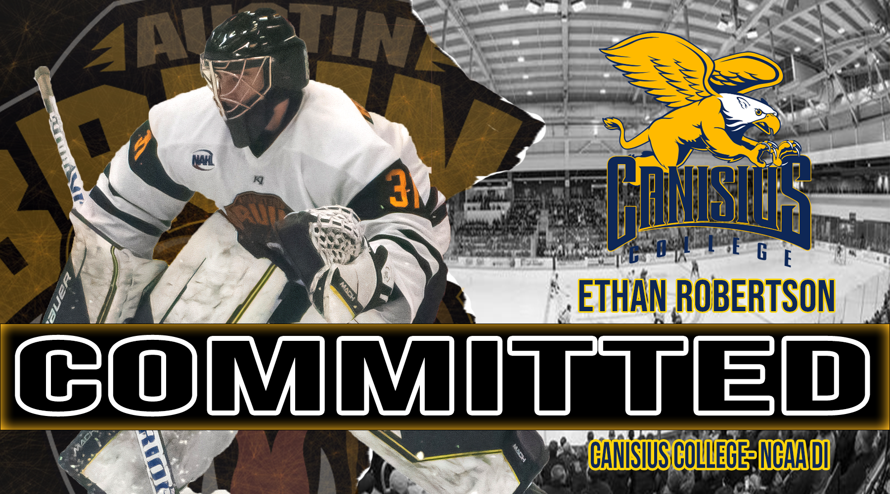 AUSTIN, MN – The Austin Bruins, proud members of the North American Hockey League (NAHL) are pleased to share that Bruins Goaltender Ethan Robertson has announced his commitment to continue his education and to play NCAA Division I Hockey at Canisius College.