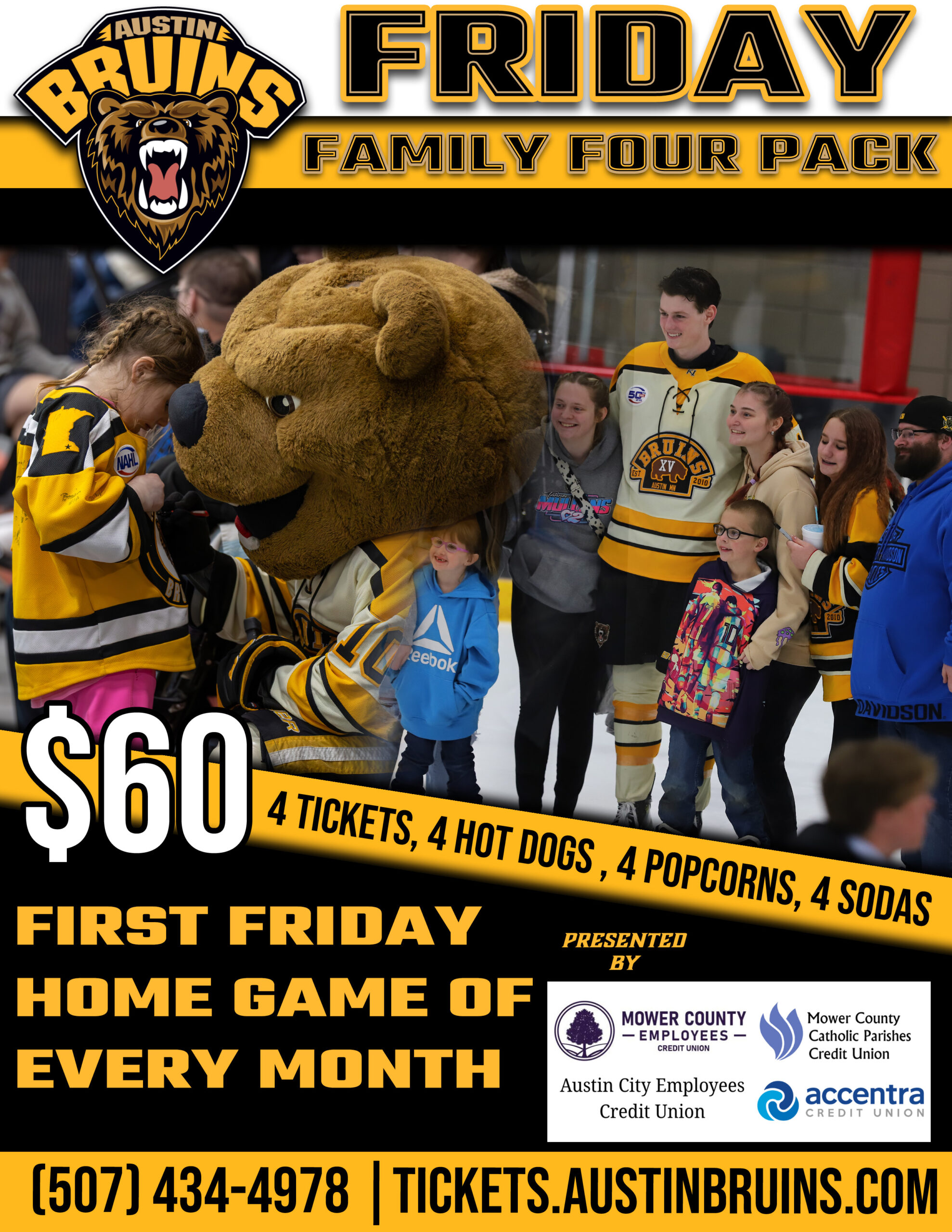Join the Austin Bruins the first Friday night of every month with our brand new FRIDAY FAMILY FOUR PACK presented by Mower County Employees Credit Union, Mower County Catholic Parishes Credit Union, Austin City Employees Credit Union and Accentra Credit Union!