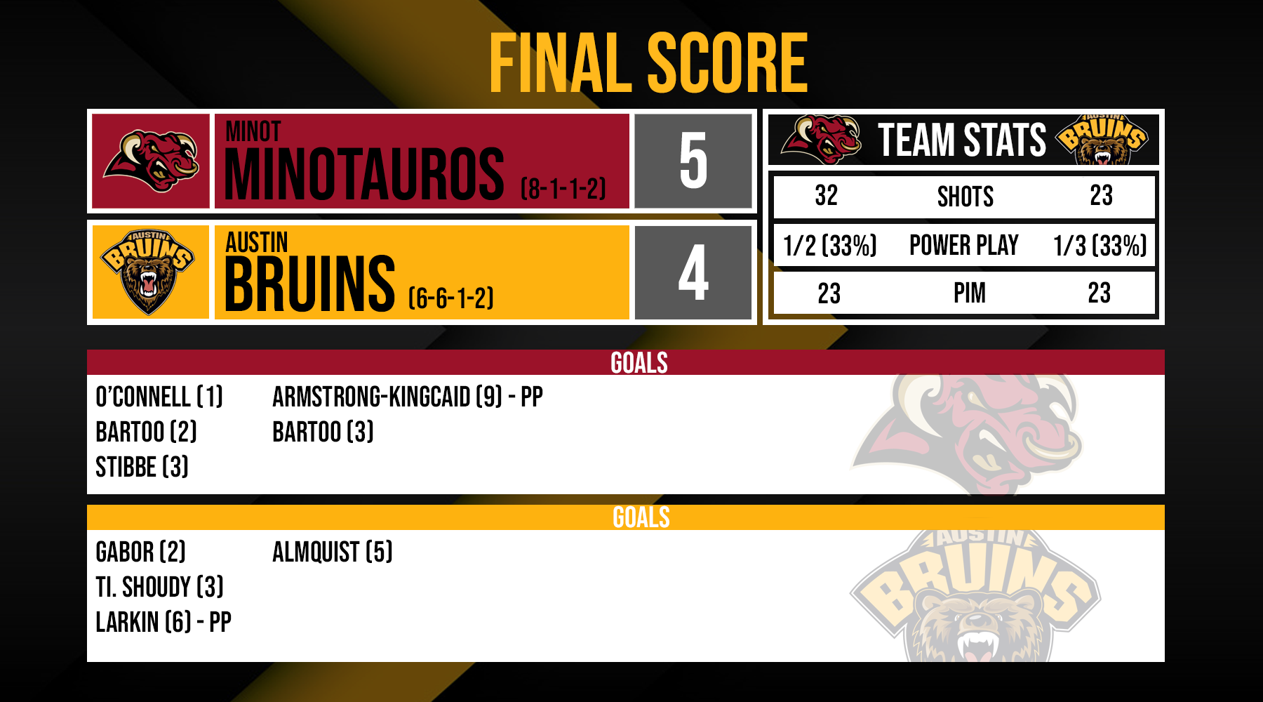 With the loss, the Bruins split the weekend with their central division rivals and fell to 6-6-1-2 on the season. For Minot, they improved to 8-1-1-2 on the season and have earned at least a point in 11 of their first 12 games this season.
