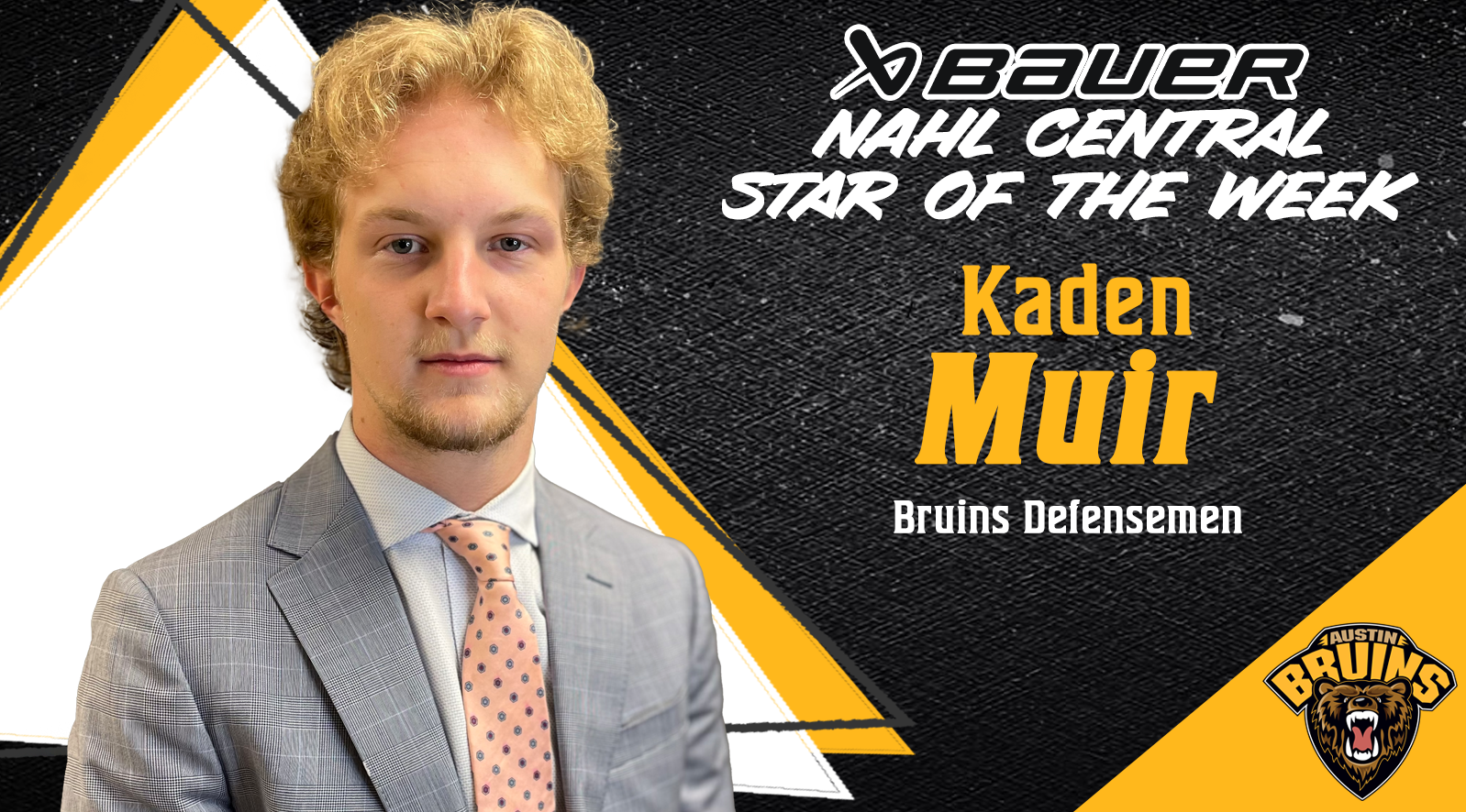 Austin defenseman Kaden Muir, 19, helped the Bruins get back on track with a weekend sweep of their home-and-home series against the North Iowa Bulls. The 6’2/190 lbs native of Toronto, ON, recorded four points in the two wins and was a +1. On Friday, Muir had a goal and an assist in a 5-3 home win. On Saturday, he had two assists in a 5-2 road win. For the season, Muir has recorded 9 points in 16 games played.