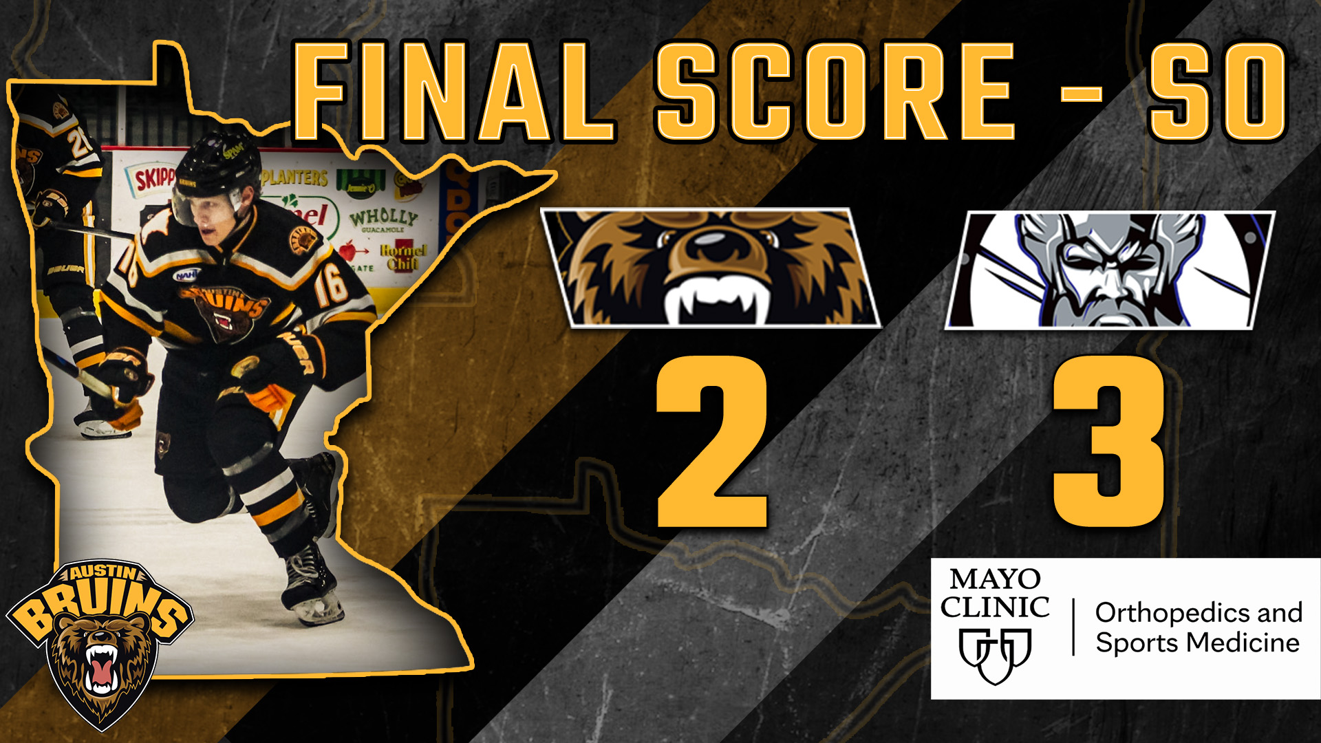 ST. CLOUD, MINN. – The Austin Bruins (31-9-2-2, 66 pts) mounted a two-goal comeback Saturday night to force overtime, but it wasn’t enough as the St. Cloud Norsemen (14-25-4-0, 32 pts) took the game 3-2 in a shootout.