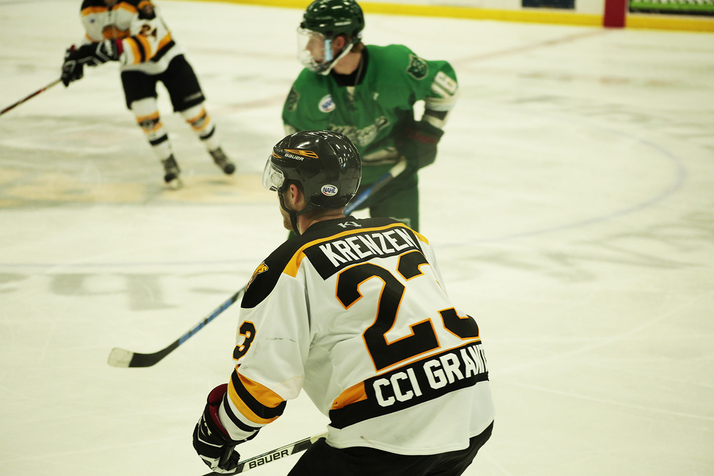 The Bruins went to the power play at 15:02, and like the Wilderness, wasted little time as Sviatoslov Kuchynski came skating in to cash his first NAHL goal, a rebound from an off angle shot from Andy Willis. Lucia, who had just come out of the box, went right back in for tripping, leading to Willis scoring a goal of his own at 16:59 – a shot from the high slot set up by good puck retrieval and movement by Travis Kothenbeutel and Lane Krenzen. With just under a minute remaining in the period, Kothenbeutel tied the game, as Evan Cholak spotted him out of the corner and Kothenbeutel was given time and space to rip off a slap shot and make it 3-3 at the end of one period.