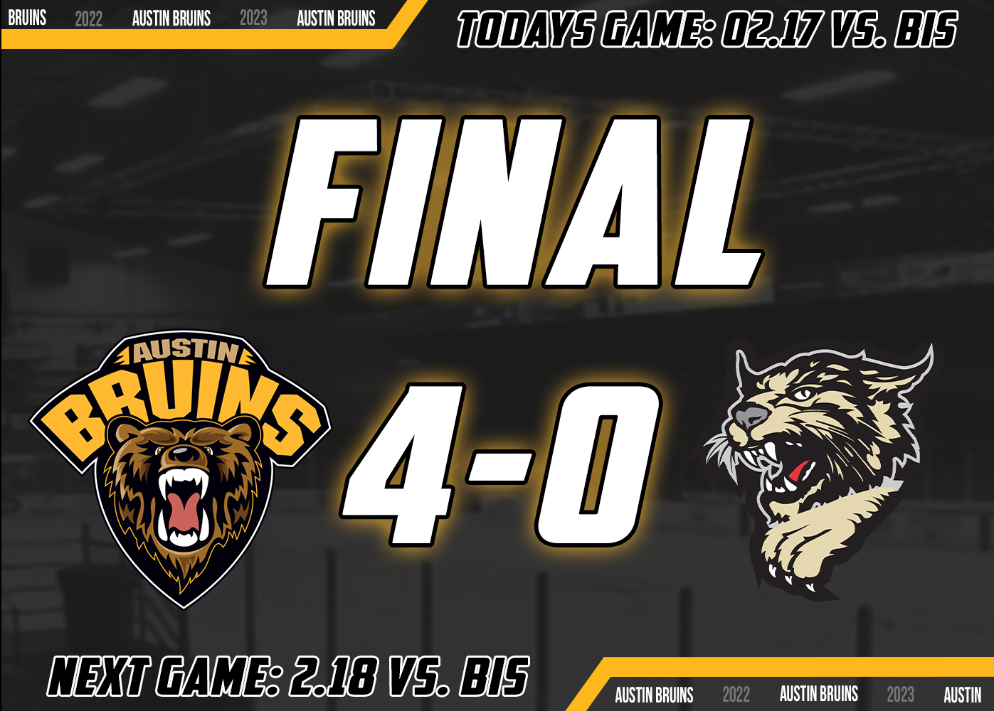 The Bruins look to add to their Division lead tomorrow night as they look to complete the weekend sweep of the Bismarck Bobcats. Game time is set for 7:05 with a free post-game skate with the Bruins following the completion of the game.